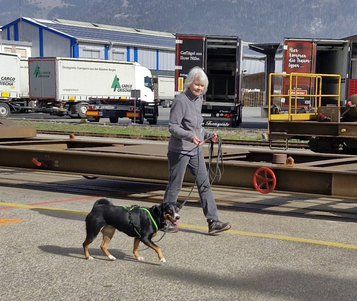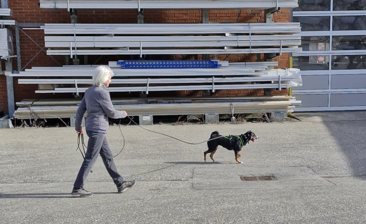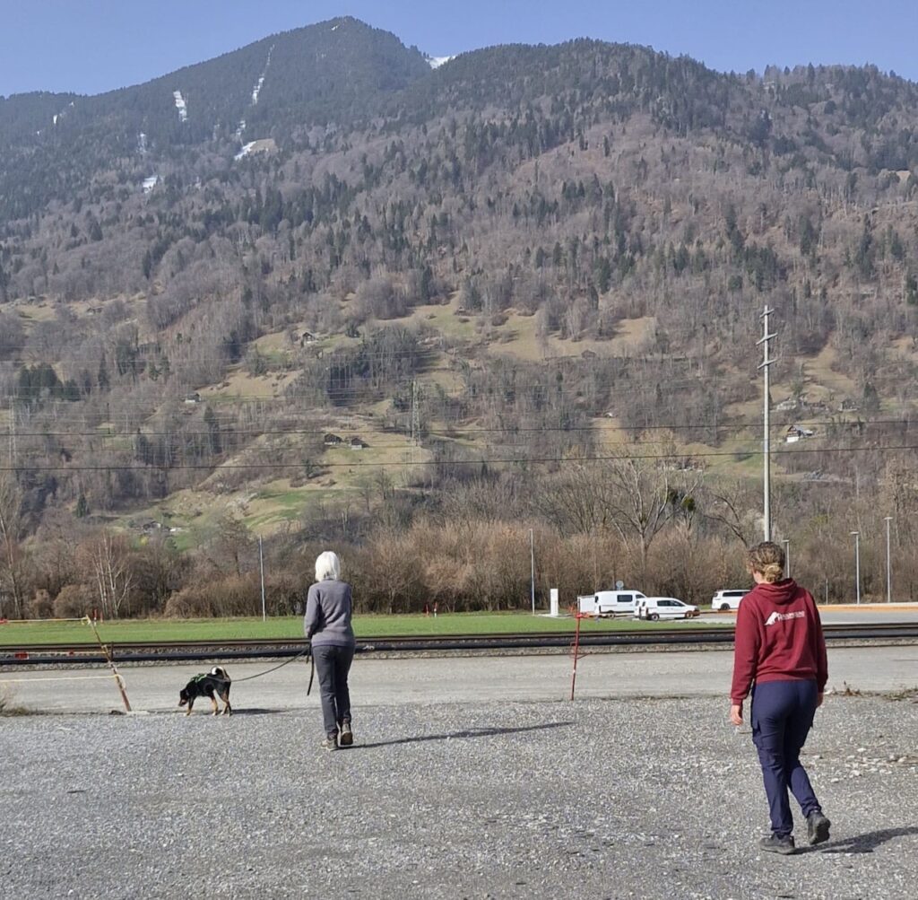 Der erste Trail hatte es in sich. Starker Wind gekoppelt mit Riesenplätzen, wie das in einem Industriegebiet so ist, machten uns das Leben buchstäblich schwer. Xändi und ich waren mehr als gefordert. Ein Platz löste den nächsten ab, öfters schaute sie mich hilfesuchend an. Ich versuchte sie so gut als möglich zu unterstützen, aber schlussendlich musste sie die Spur finden. Das Zielverhalten, Xändi hat dann immer mehr Zug auf der Leine, kündigte sich an. Nochmals kamen wir an einen Platz, den Letzten, den Blick den wir dann von ihr erhielten sagte alles: jetzt aber nicht schon wieder ?!? Allgemeines Gelächter. Dann ging sie stramm Richtung Versteckperson, geschafft, im wahrsten Sinne des Wortes!!